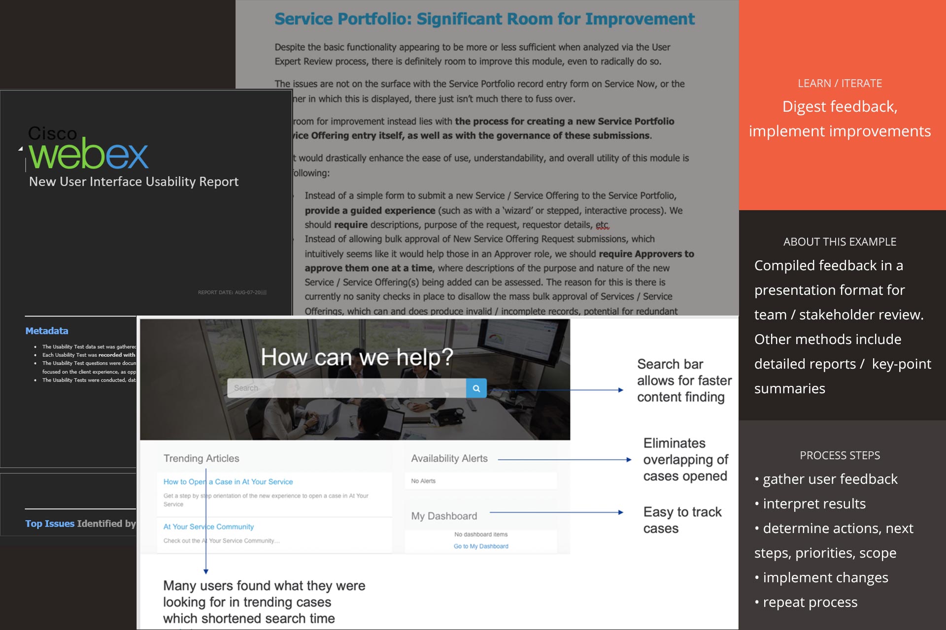 results, presentation collateral and user interview / feedback reports.
