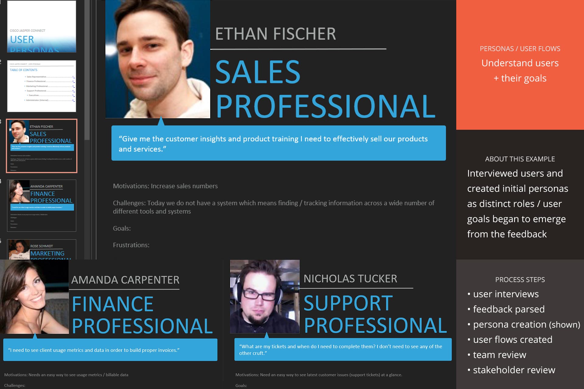 results, presentation collateral and user interview / feedback reports.